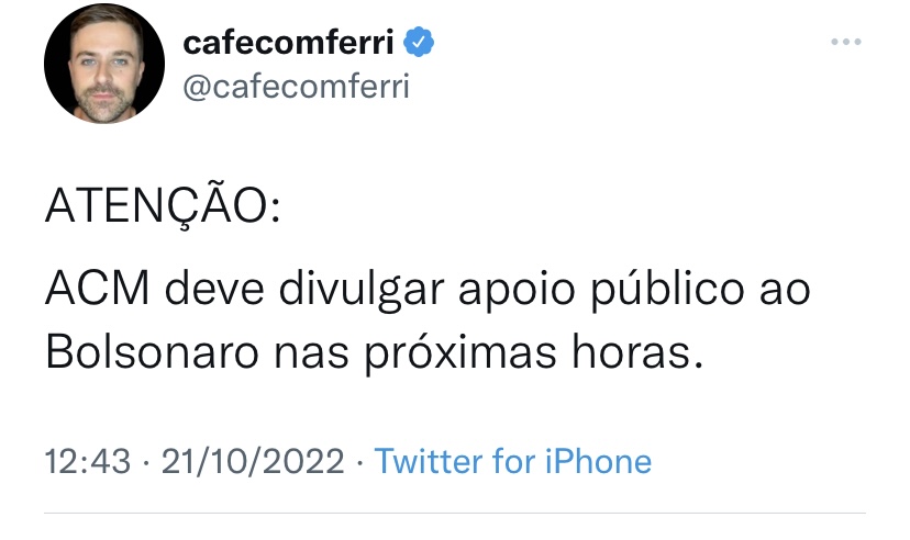 A informação está circulando nos bastidores da política baiana desde a noite desta quinta-feira. Nesta sexta, porém, Rafael Ferri, bastante respeitado nos meios bolsonaristas, confirmou que o acordo deve ser selado “nas próximas horas”.
