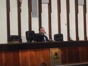 O deputado estadual Adolfo Menezes senta na cadeira de presidente da Alba na tarde desta terça-feira (27).