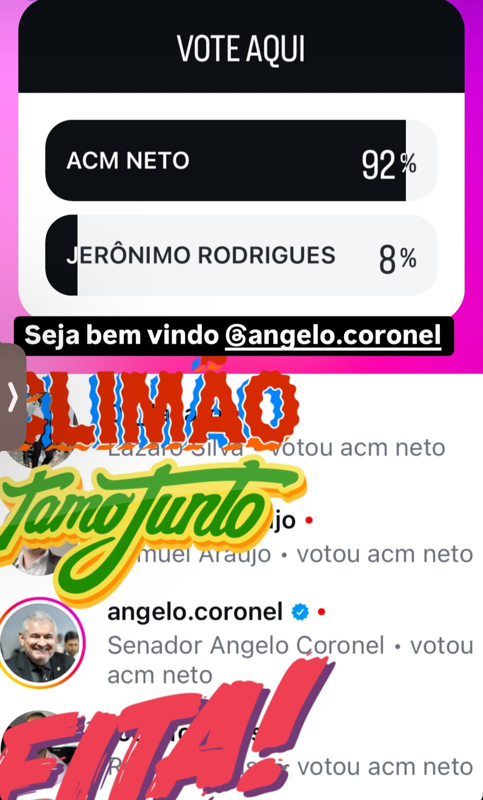 O parlamentar participou de uma enquete e votou no nome do ex-prefeito ACM Neto na disputa contra Jerônimo Rodrigues para o governo da Bahia em 2026. Enquetes não tem qualquer valor estatístico, mas revelam muita coisa.