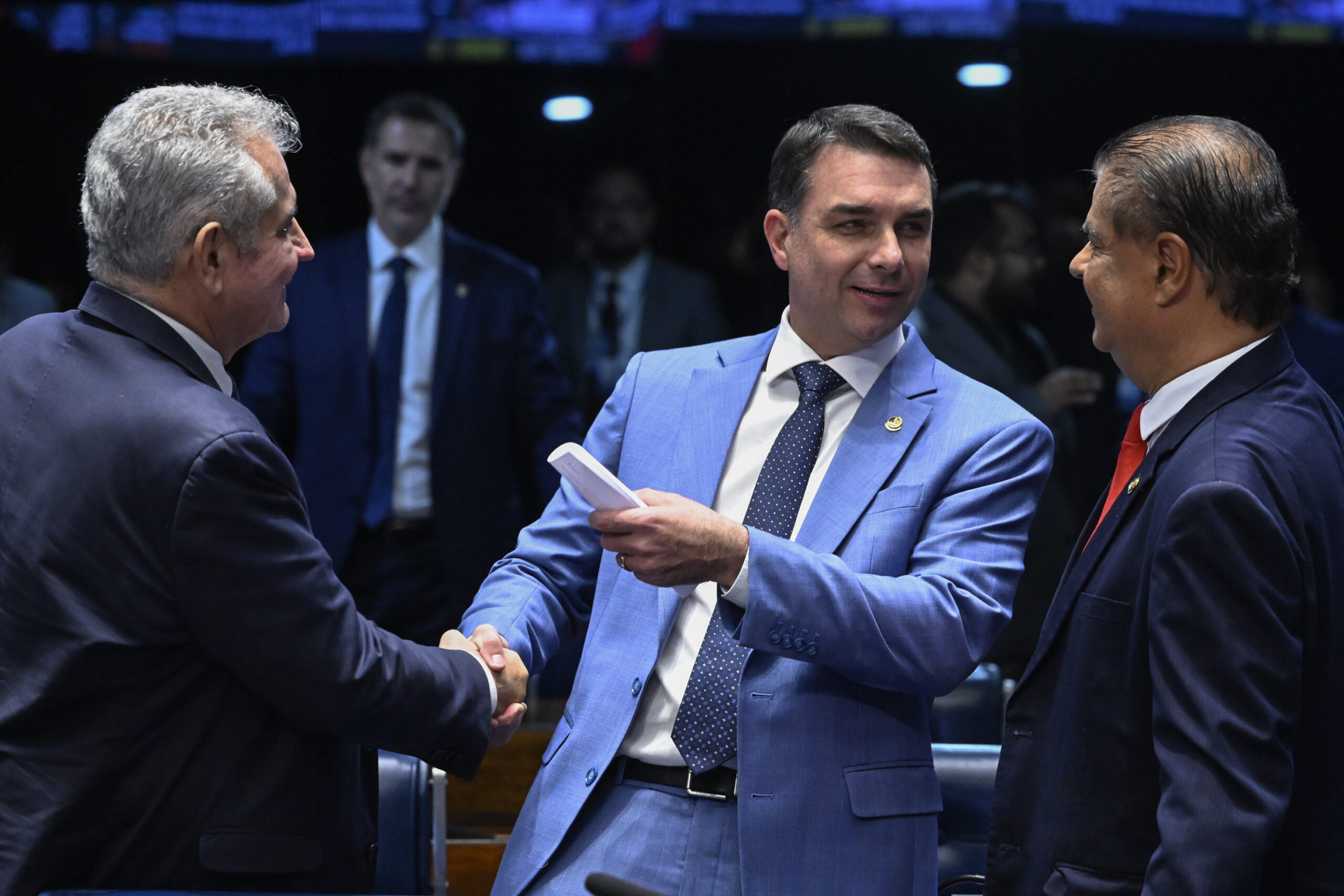 O senador Angelo Coronel foi flagrado em uma conversa em tom descontraído com o senador Flávio Bolsonaro, nesta quarta-feira (15).