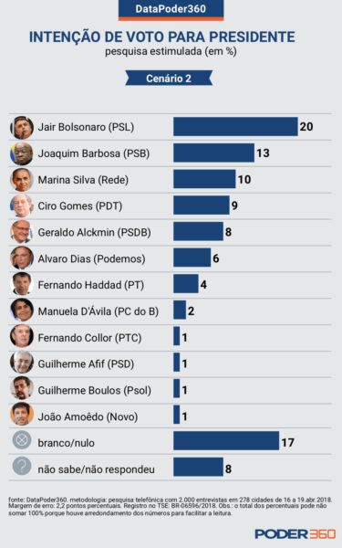 A pesquisa DataPoder360 de intenção de votos para presidente da República aponta uma vitória de Joaquim Barbosa (PSB)contra Jair Bolsonaro (PSL-RJ) num eventual segundo turno. O levantamento testou apenas 2 cenários: No primeiro deles, Bolsonaro ganha de Alckmin com vantagem de 41% a 18%; no outro confronto testado de 2º turno, o resultado dá vitória a Joaquim Barbosa, com 37%, contra 32% de Bolsonaro.