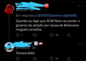 “Quando eu digo que ACM Neto vai perder o governo do estado por causa de Bolsonaro, ninguém acredita”, disse um internauta, que foi respondido por uma outra conta: “Tomara”.