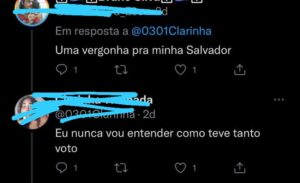 Outras pessoas continuaram as críticas. “Uma vergonha para minha Salvador”, disse uma outra pessoa. “Eu nunca vou entender como teve tanto voto (Bruno)”, respondeu outra.