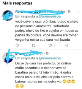 “Ok, enganador de besta… Agora para de tirar linhas, devolve o domingo é meia”. “Você está fazendo sua obrigação”, respondeu um outro seguidor. “Você deveria usar o ônbus lotado diariamente, sobretudo podre, cheio de lixo e sujeira em todas as partes do ônibus. Deveria tomar vergonha nessa cara mal lavada”, comentou outro homem.