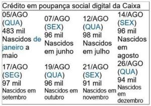 Segundo a portaria, tem direito o público beneficiário do auxílio emergencial que tenha feito o procedimento de contestação por meio da plataforma digital entre os dias 24 de abril e 19 de julho de 2020 e tenha sido considerado elegível receberá o crédito da primeira parcela em poupança social digital aberta em seu nome, conforme o seguinte calendário: