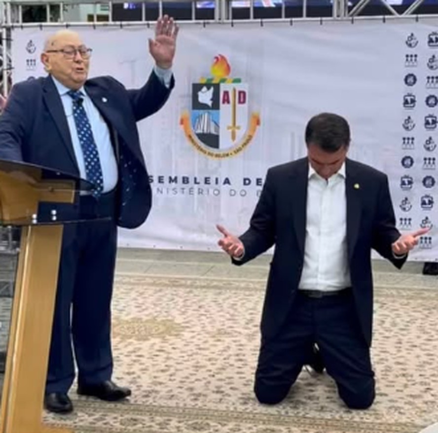 Durante o evento, o senador publicou um vídeo nas redes sociais em que aparece ajoelhado recebendo uma oração do bispo, diante de dezenas de pastores. Na fala, o líder religioso fez menção ao futuro político de Flávio, pedindo que ele fosse conduzido à Presidência da República, após o que o parlamentar discursou no local.