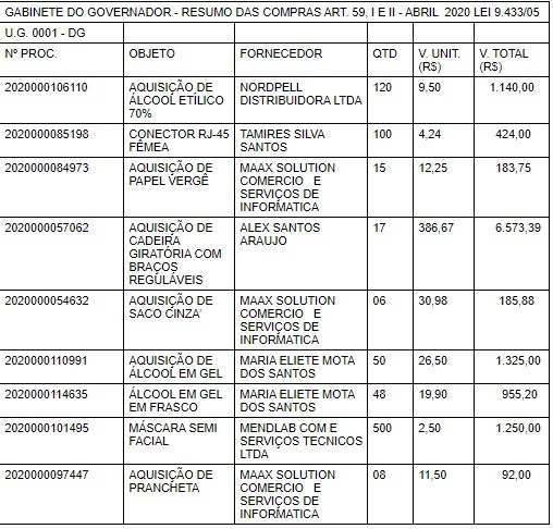 O gabinete comprou 120 frascos de álcool 70% a R$ 9,50 cada, 50 frascos de álcool em gel a R$ 26,50 cada, 500 máscaras semi facial a R$ 2,50 cada e até oito pranchetas a R$ 11,50 cada.