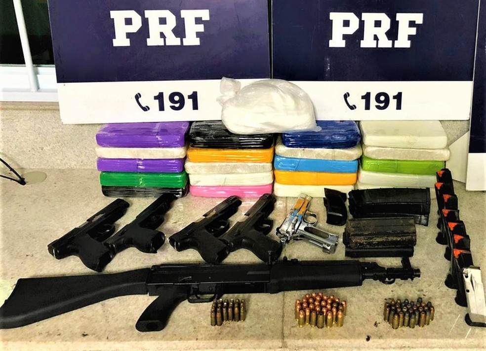 Durante abordagem, os agentes contaram com a ajuda de um cão farejador, que identificou uma mala com mais de 21 quilos de cocaína, um fuzil 5.56, de origem estrangeira, uma pistola 9 mm e quatro de 40 mm, 12 carregadores, além de dezenas de munições.
