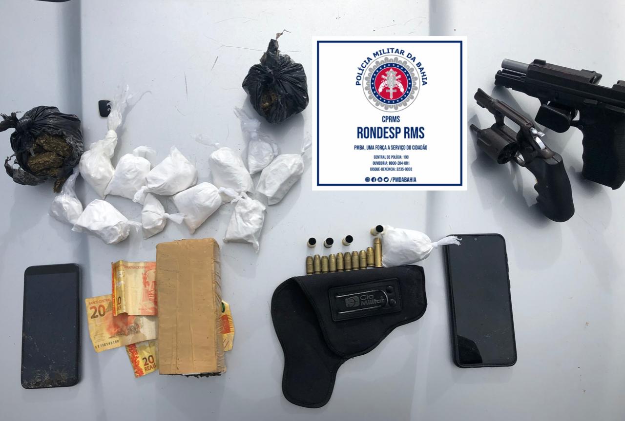Uma pistola calibre 380, um revólver calibre 38, drogas e munições foram encontrados no início da tarde desta quarta-feira (3), por equipes das Rondas Especiais (Rondesp) RMS, com uma dupla suspeita de tráfico de drogas em Mata de São João, Região Metropolitana de Salvador.