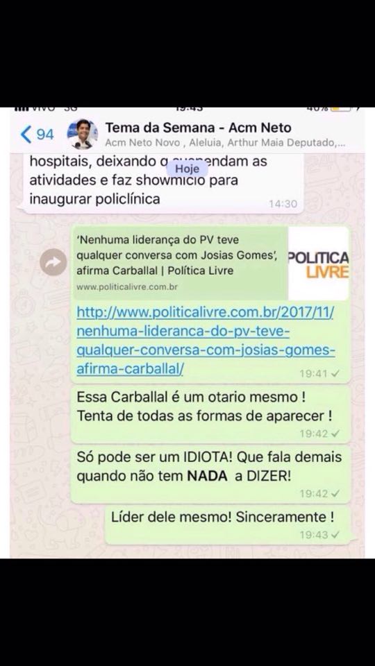 O print vazado neste sábado (04) do grupo de WhatsApp do qual participa o prefeito ACM Neto (DEM) e seus principais aliados sugere três coisas: o prefeito tem a metodologia de escolher um tema central para que os aliados mirem na gestão do governador Rui Costa (PT) de forma sincronizada; a segunda é que alguém não gosta do líder do prefeito na Câmara, Henrique Carballal (PV).
