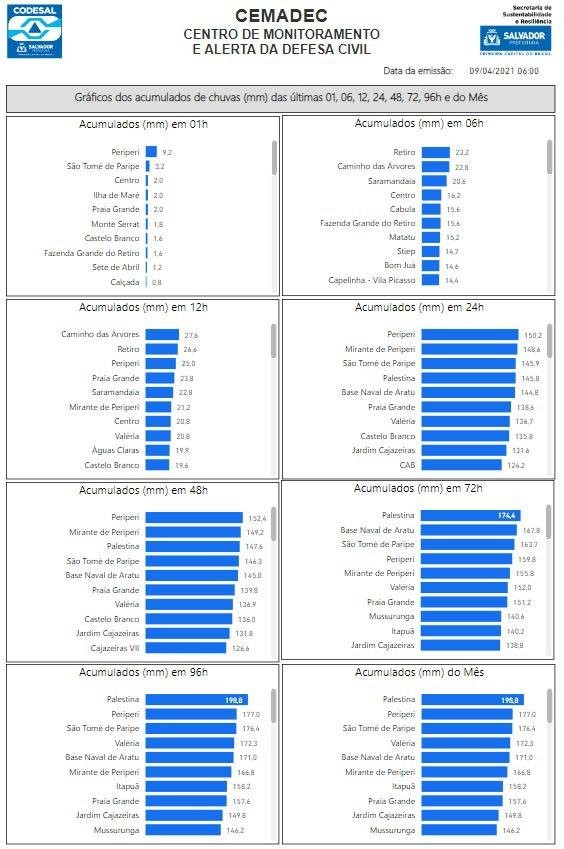 Os bairros de Periperi, Mirante de Periperi e São Tomé de Paripe, no Subúrbio de Salvador, são os que mais concentraram acumulado de chuva nas últimas 24h, de acordo com as informações do último balanço da Defesa Civil. Em Periperi choveu 150,2 mm.