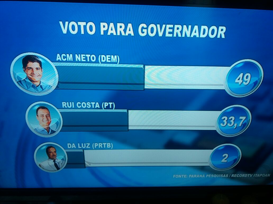 A tão esperada pesquisa de intenção de voto feita pelo Instituto Paraná foi divulgada pela RecordTV nesta quinta-feira (30). De acordo com o levantamento, o prefeito ACM Neto (DEM) continua muito à frente do governador Rui Costa (PT).