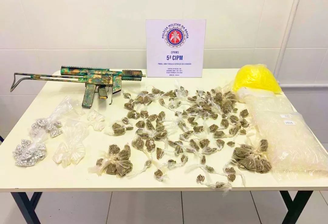 Uma metralhadora calibre 9mm e 814 porções de entorpecentes (crack, cocaína e maconha) foram apreendidos pelo Pelotão de Emprego Tático Operacional (Peto), da 5ª Companhia Independente da Polícia Militar (CIPM/Vera Cruz). Os materiais foram localizados durante rondas ostensivas em Mar Grande, em Vera Cruz, Região Metropolitana de Salvador (RMS), na terça-feira (18).
