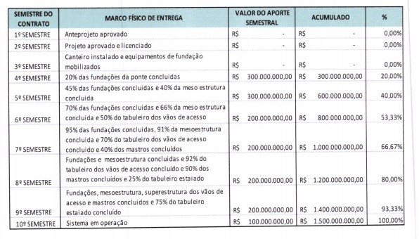 O Governo se comprometeu, no documento, a fazer o primeiro repasse no quarto semestre da obra – ou seja, no segundo semestre de 2022. O primeiro aporte será de R$ 300 milhões.