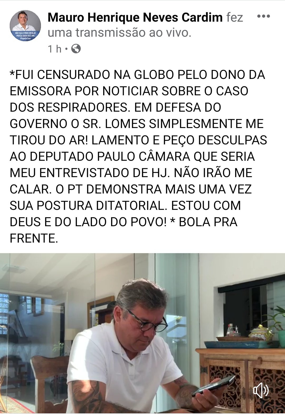 “Fui censurado na Globo pelo dono da emissora por noticiar o caso dos respiradores. Em defesa do governo, o Sr. Lomes [dono da emissora], simplesmente me tirou do ar! Lamento e peço desculpas ao deputado Paulo Câmara, que seria meu entrevistado de hoje. Não irão me calar. O PT demonstra miss uma vez sua postura ditatorial. Estou com Deus e do lado do povo!”, desabafou o radialista.