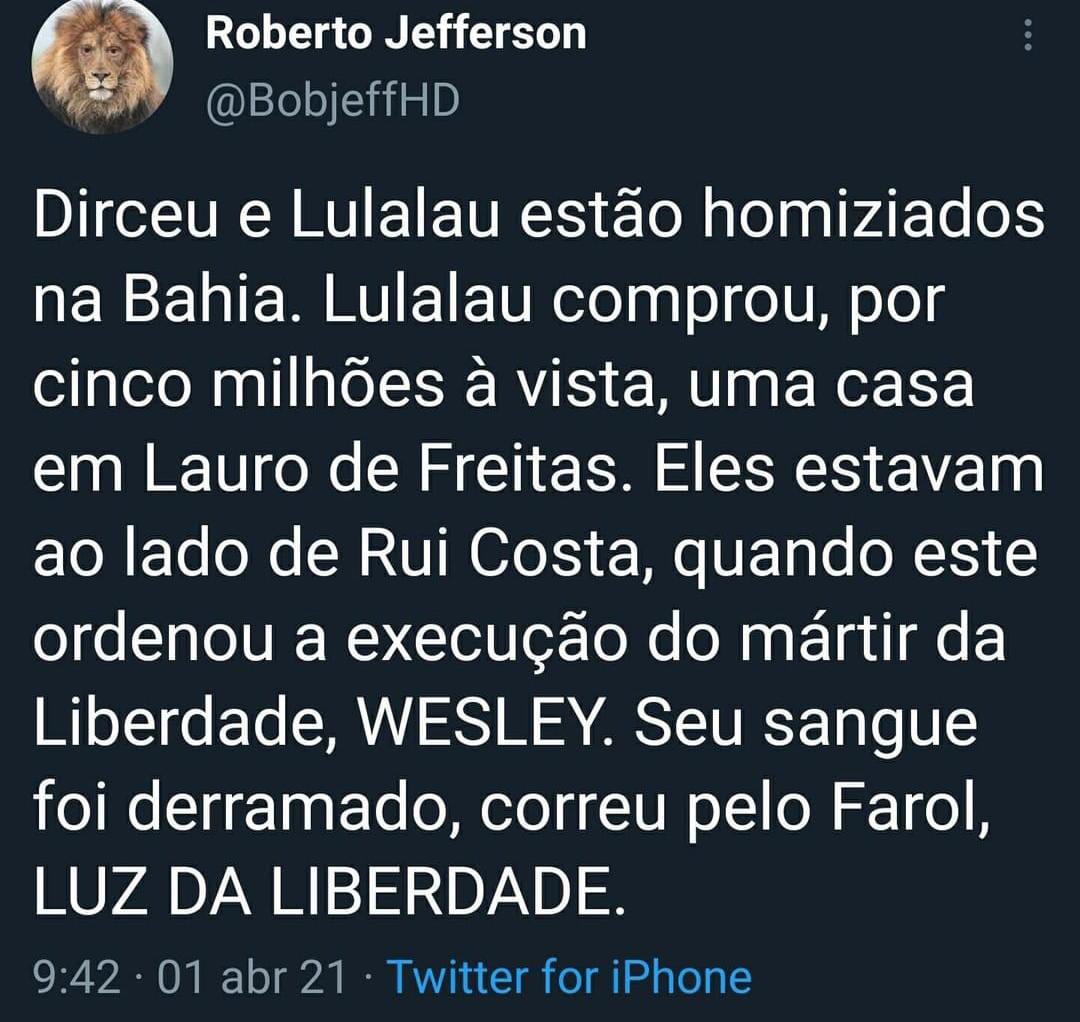 “Dirceu e Lulalau estão homiziados na Bahia. Lulalau comprou, por cinco milhões à vista, uma casa em Lauro de Freitas. Eles estavam ao lado de Rui Costa, quando este ordenou a execução do mártir da Liberdade, WESLEY. Seu sangue foi derramado, correu pelo Farol.”, escreveu.