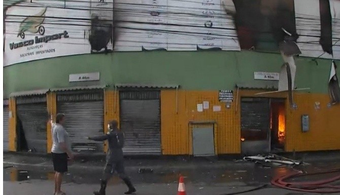 O teto do estabelecimento desabou. Vizinhos temem que o foco se alastre para outros imóveis. Ao lado da loja de auto peças está um galpão com material inflamável e itens recicláveis.