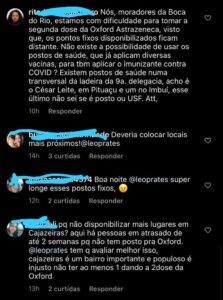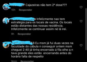 “Deveria colocar locais mais próximos”, respondeu uma outra seguidora. “Super longe esses pontos fixos”, reclama uma outra internauta. “E a população de Cajazeiras, vai tomar aonde? Sério que temos que sair daqui para outros bairro desde quando aqui tem vários postos?”, questiona outra melhor em tom de reclamação, moradora do bairro de Cajazeiras, um dos mais afastados de Salvador.