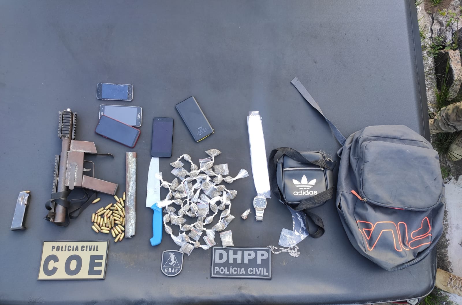 No local, foram encontrados uma submetralhadora calibre 9mm com um carregador alongado, um carregador de pistola 9mm com capacidade para 17 munições, 50 munições para o mesmo calibre, sete munições para calibre 38, porções de maconha embaladas para comercialização, quatro celulares e sacos plásticos para acondicionar drogas.