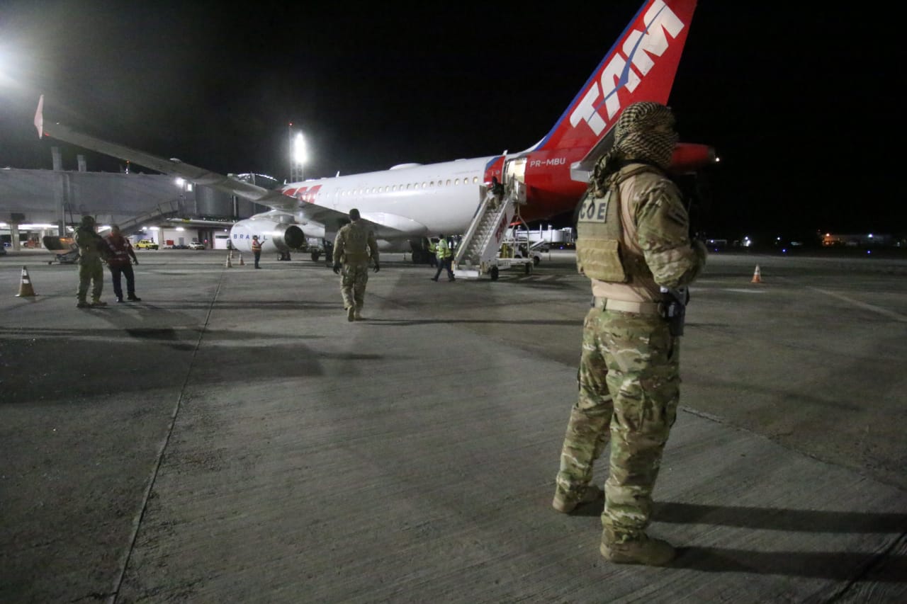 Algemado e custodiado por policiais civis baianos, o suspeito foi trazido em um voo comercial. Equipes da Coordenação de Operações Especiais (COE) realizaram a escolta do homem.