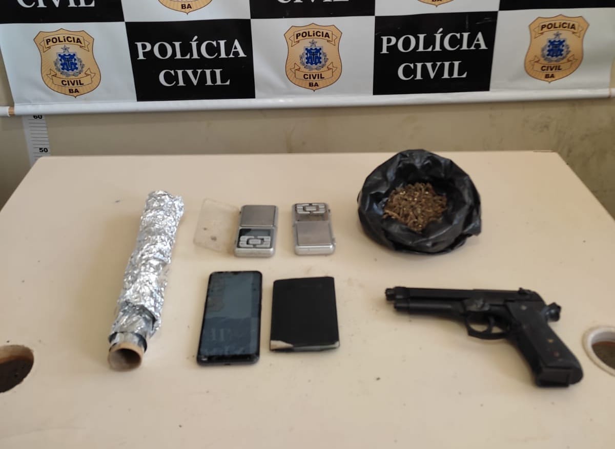 Três pessoas foram presas em flagrante com uma porção de maconha, duas balanças, um simulacro, um celular e material usado para embalar drogas, em um conjunto residencial no bairro do Cajueiro, na cidade de Santo Antônio de Jesus.