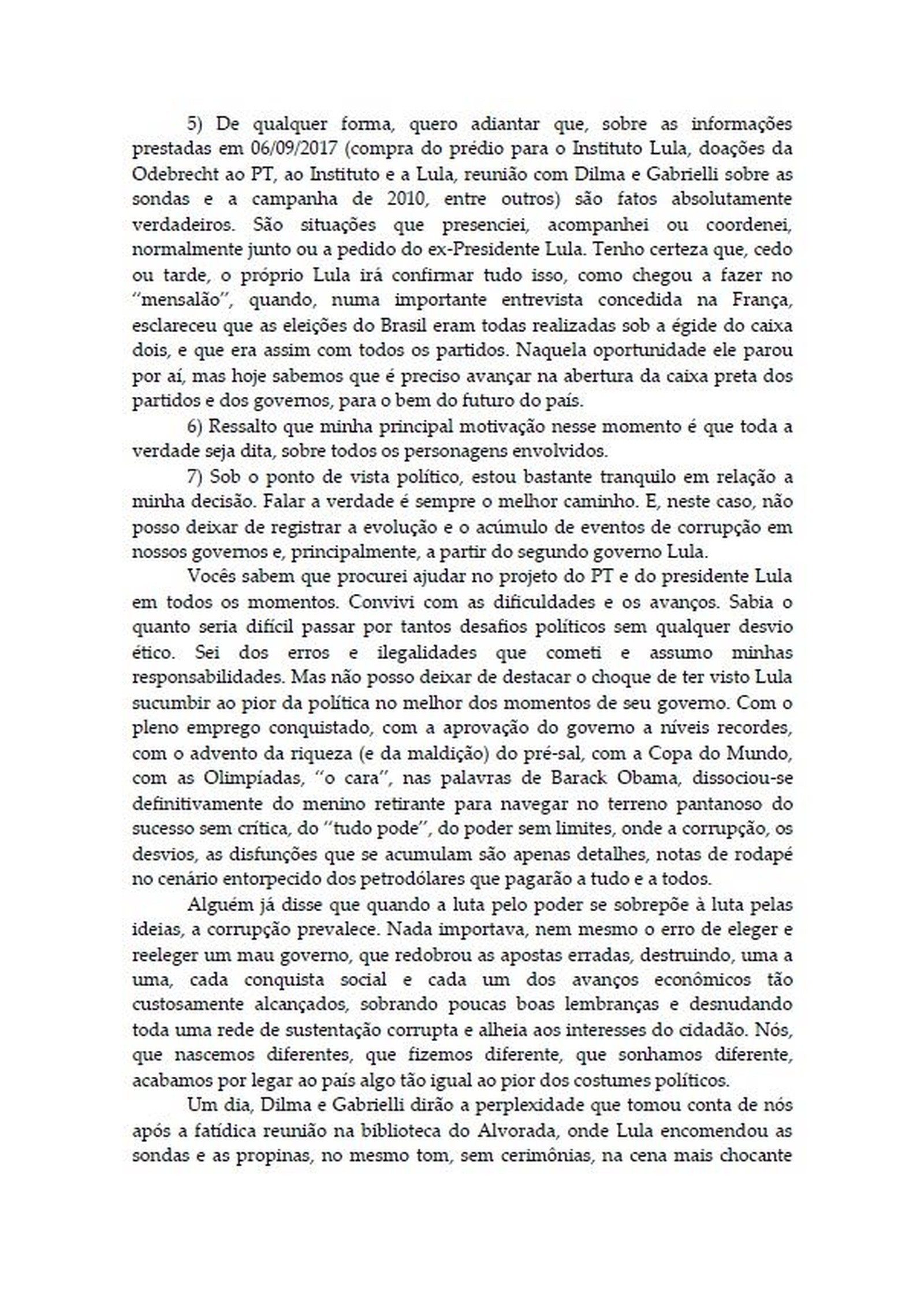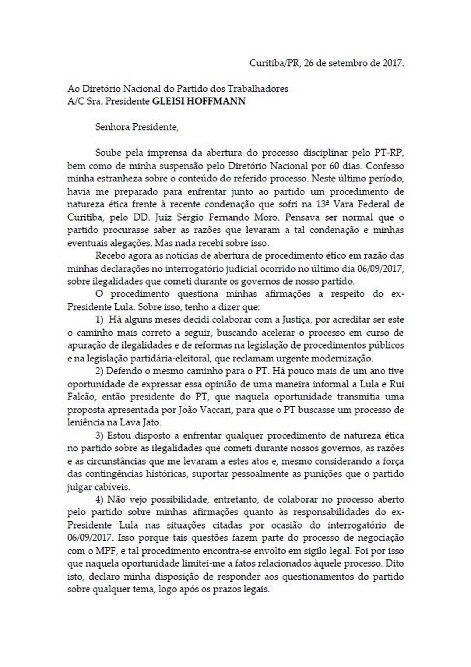 “Estou disposto a enfrentar qualquer procedimento de natureza ética no partido sobre as ilegalidades que cometi durante nossos governos, as razões e as circunstâncias que me levaram a estes atos e, mesmo considerando a força das contingências históricas, suportar pessoalmente as punições que o partido julgar cabíveis”, diz trecho do documento.