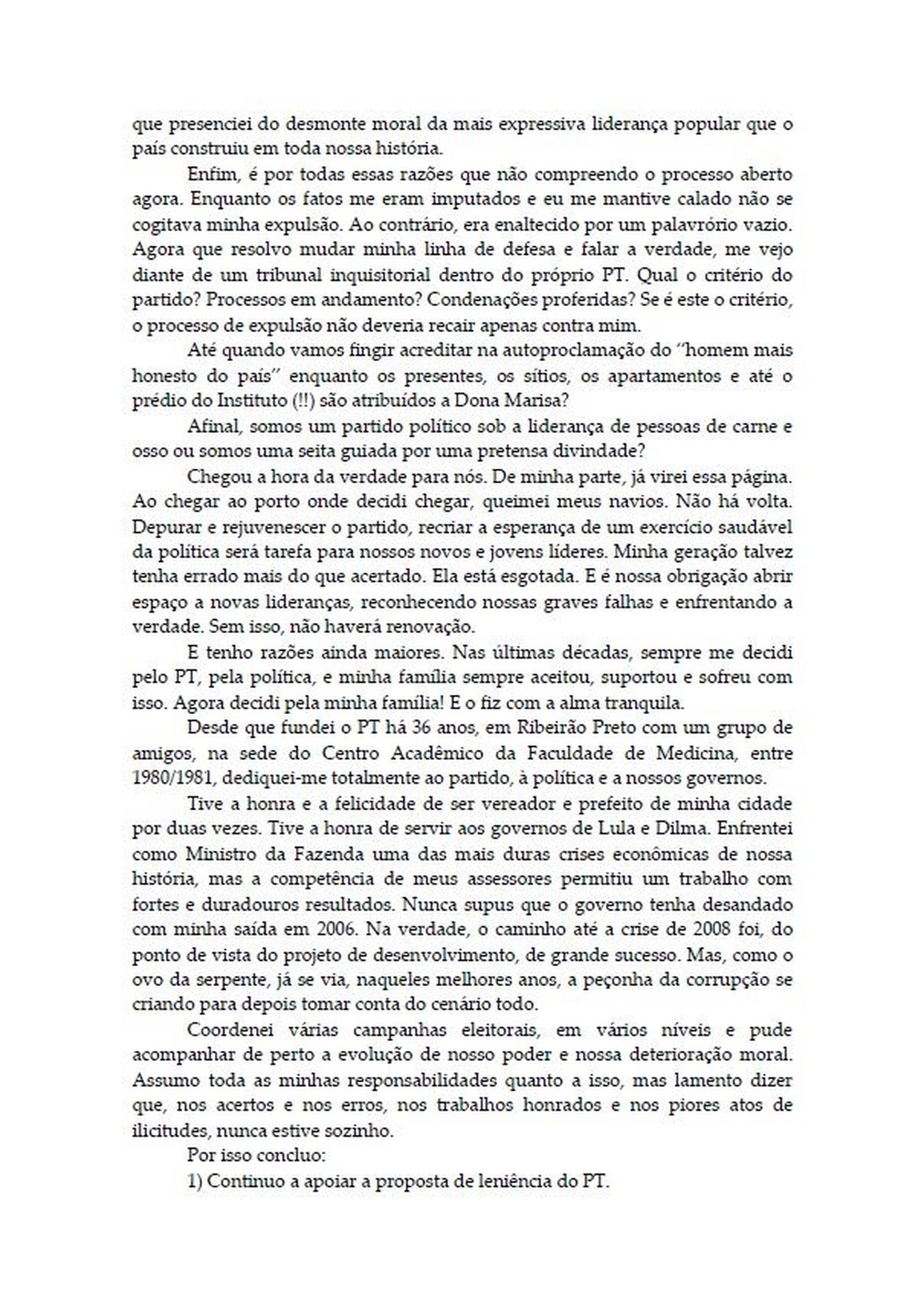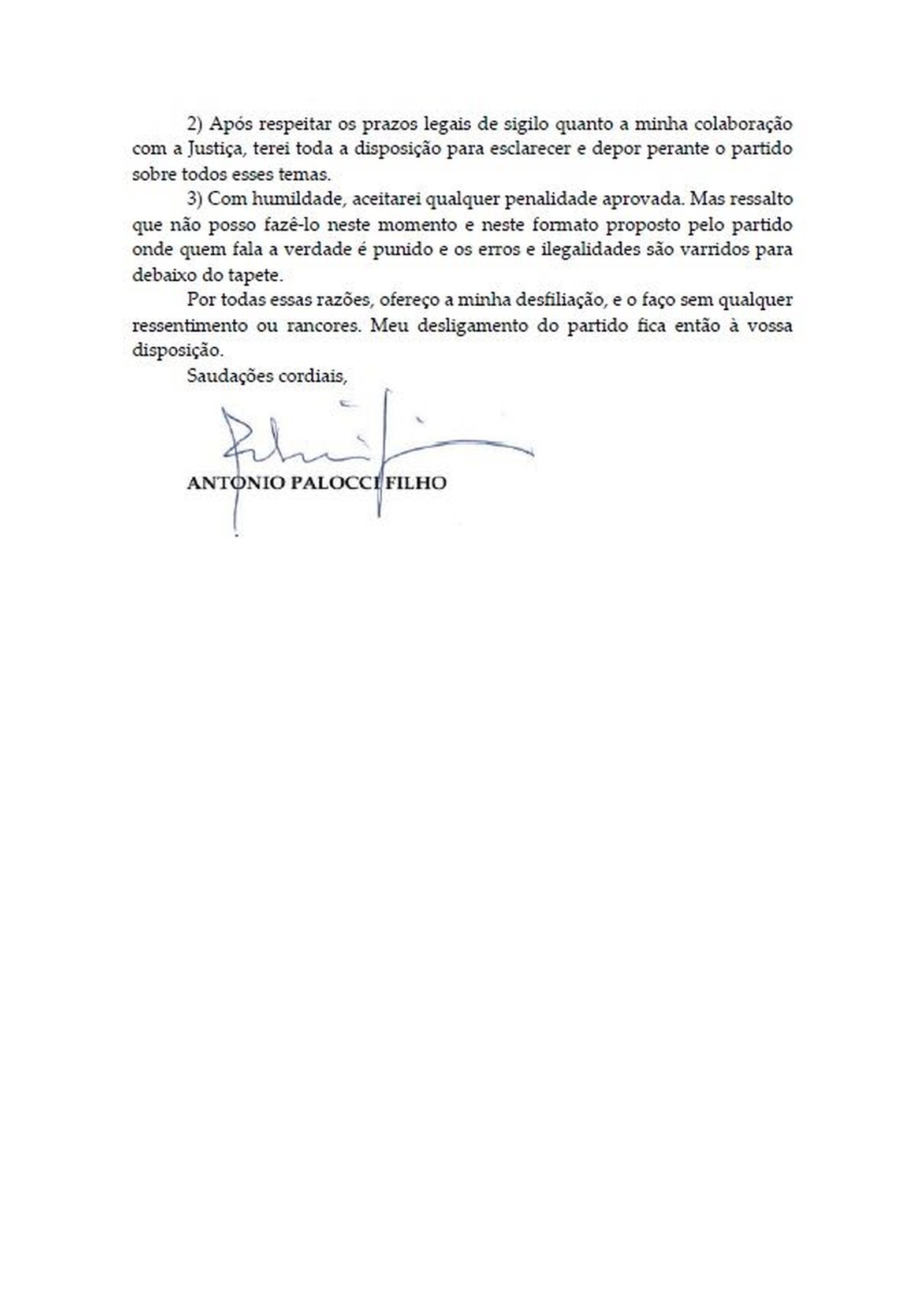 Antônio Palocci encaminhou à presidente nacional da sigla, senadora Gleisi Hoffmann (PR), uma carta em que pede desfiliação do partido e acusa Lula de “sucumbir ao pior da política”. O ex-ministro reiterou as acusações feitas em depoimento ao juiz Sérgio Moro no dia 13 deste mês e ainda sugere que o PT firme um acordo de leniência “reconhecendo as graves falhas e enfrentando a verdade”.