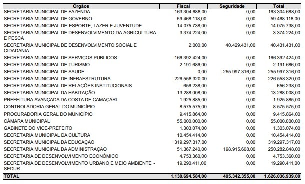 No total, o orçamento de Camaçari para 2021 será de R$ 1,6 bilhão. Desse valor, R$ 59 milhões serão gastos na Secretaria de Governo, enquanto que R$ 13 milhões serão usados na Secretaria de Habitação e R$ 3 milhões na Secretaria de Desenvolvimento da Agricultura e Pesca.