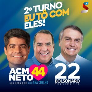 No card, Sandro aparece ao lado de ACM Neto e Bolsonaro. Na legenda, o parlamentar deixa claro que a decisão é pessoal, e não do partido. “No segundo turno, eu, deputado Sandro Régis, tô colado com eles”, escreveu o deputado.
